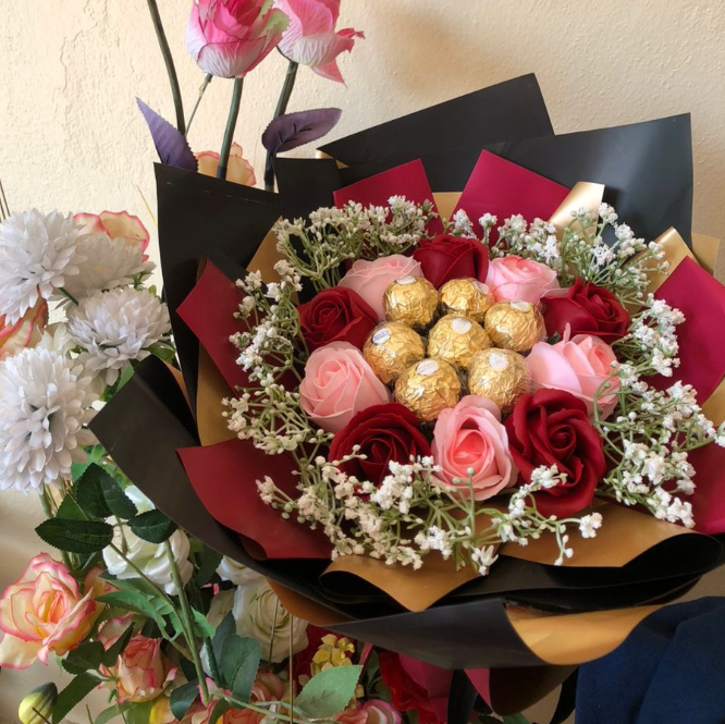 This stunning bouquet combines the beauty of artificial roses with the indulgence of Ferrero Rocher chocolates. Featuring delicate pink and rich red roses, accented with white baby’s breath and lush greenery, it is wrapped elegantly in gold and maroon paper. Standing tall behind the main bouquet are decorative pink blooms with purple accents that add height and sophistication. Perfect as a gift for any special occasion, this bouquet offers both a visual and delicious treat for your loved ones, making it an ideal choice for romantic gestures or celebrations.